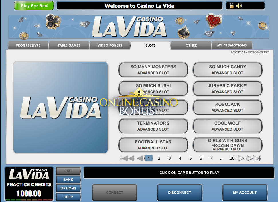 Some of Casino La Vida’s newest online video slots include Robo Jack, Fish Party, Terminator 2, Football Star, Cool Wolf, Girls with Guns: Frozen Dawn, High Society, Untamed: Crowned Eagle, Loose Cannon and Avalon II: The Quest for the Grail . You can also play Lucky Koi, Secret Santa, Rhyming Reels: Georgie Porgie, Dolphin Quest, The Dark Knight Rises, Sweet Harvest, Playboy, In It to Win It, Dr. Watts Up, Rhyming Reels: Jack and Jill, Bust the Bank, Mystic Dreams and many more video slot games at this site.
