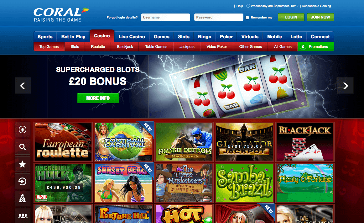 Coral Casino is one of the most well-known online casinos. A huge hit with casino players in the United Kingdom; having a Coral Casino account will also get you access to their sports betting, in-play sports betting, live casino, games, slots, bingo, poker, virtual, mobile and lotto based gaming domains.