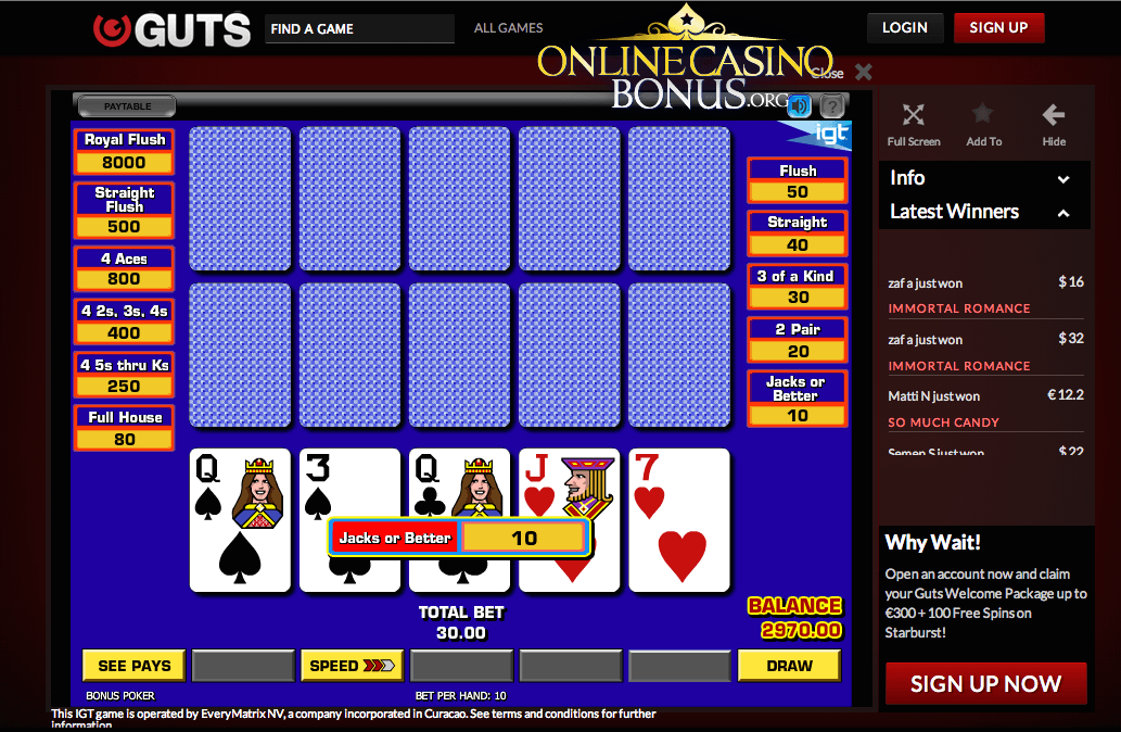 Video Poker games can also be enjoyed at Guts Casino. Such titles include Bonus Poker, Game King: Bonus Poker, Triple Play Draw Poker, Bonus Deuces Wild, Deuces Wild, All American, Game King: Double Bonus Poker, Game King: Double Double Bonus Poker, Game King: Jacks or Better, Joker Wild, Aces and Eights, Jacks or Better, Double Bonus Poker and Double Double Bonus Poker games.