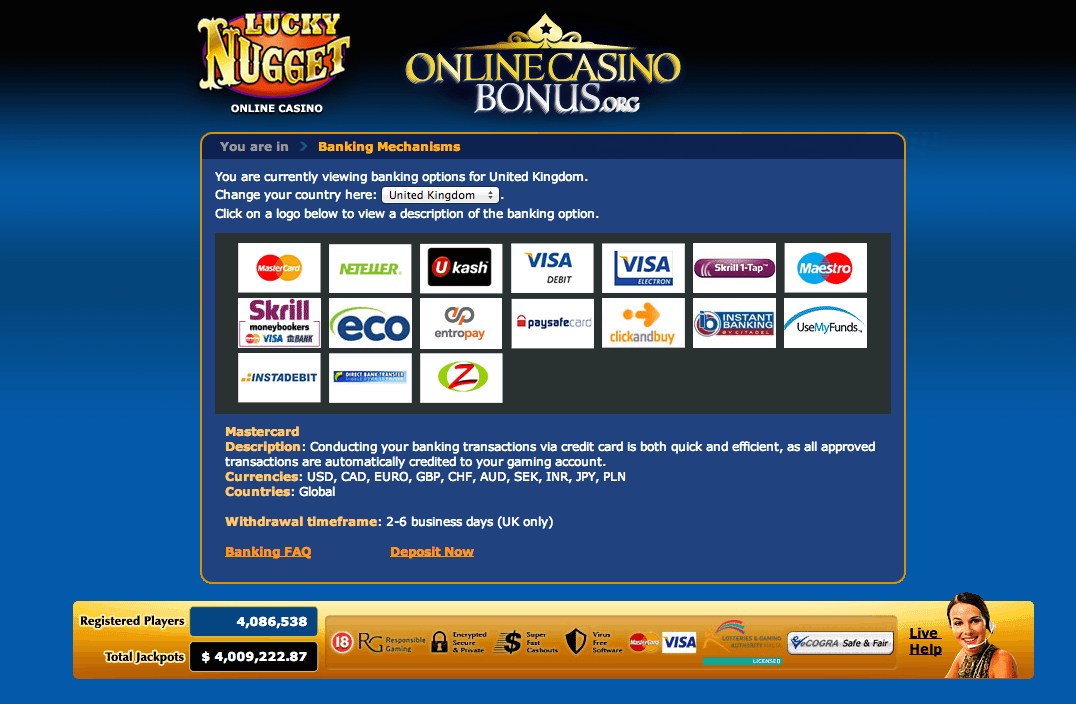 Lucky Nugget offers a host of reputable deposit methods that are guaranteed to be 100% safe and secure. The transaction process is quick and easy to follow once you’ve decided on one of the many methods available to you. Just take your pick from various regional debit cards, credit cards, web wallets, echecks and prepaid solutions. Some of the big names available include Visa, MasterCard, Maestro, Entropay, Ukash and NETELLER to name only a few.