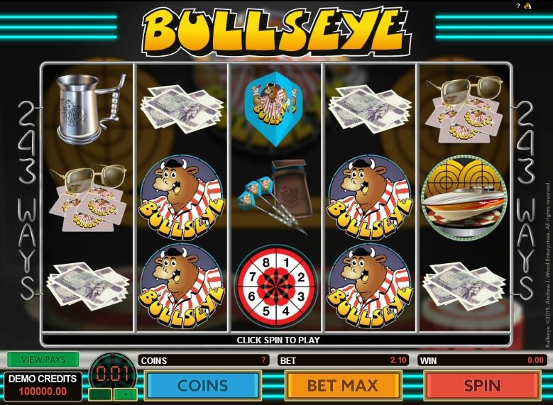 The slot machines is backed by Wild Multiplier symbol which consists of The Dart Man symbol which is basically a wild multiplier symbols and acts as a substitute for other symbols in order to finish winning combinations and multiplying the payout. There is also a Spin Dart Board as a scatter symbol in the game which comes on the 3rd reel. Lastly, it features Bulls Eye bonus feature which gets activated when the Spin Dart Board scatter symbol comes on the payline with the higest bet of 3 coins.