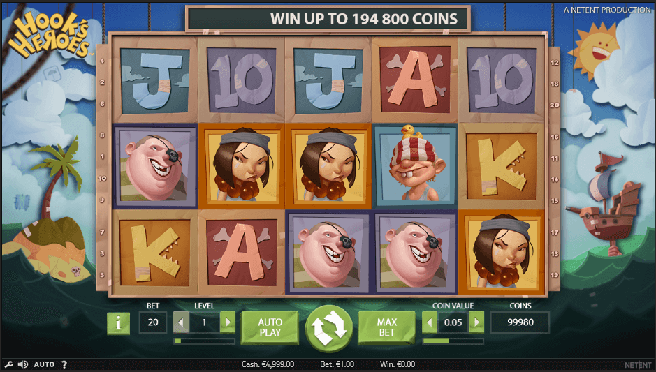 The Hook’s Heroes video slot has a design that is partially inspired by the Ghost Pirates game, another game that Netent created a while ago. However, the Hook’s Heroes game only has twenty lines. A player on the Hook’s Heroes video slot will get more ways to win big through the bonus games while also using all lines at once without having to use multiple coins just to get access to multiple ways to win. Of course, the player will have to watch for the total value of a spin bet before actually getting a spin going so the right spin total can be predicted.