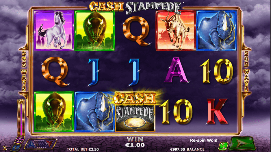 The Cash Stampede game features a design where a player can get wild symbols on the third reel. The wild symbol can link up to two like animal symbols on the first and second reels. The player will get a re-spin at this point to add to the potential to get more winnings off of more like symbols on that same screen with the previous winning symbols being frozen on the screen. Re-spins can be added when more winning symbols are revealed after every new spin. The key is to get as many animals to join in on the stampede in order to win at this point.