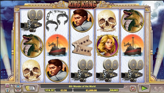 In this 25 payline video slot you’ll encounter an exquisite design, in terms of rescuing the classic elements of King Kong. This enormous ape will be accompanied with the iconic symbols such as a Ship, a Biplane, A Skill, Movie Tickets, Movie Camera, a Tarantula and why not a T-Rex. The most important icon (in terms of earnings) is the Female Character, always alongside this monster and she develops a rather bizarre relationship with Kong.