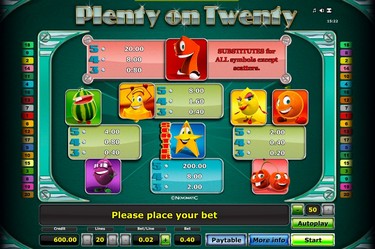 Plenty on Twenty is a 5-reel, 20 payline video slot, that adopts a gameplay structure just like many other popular online slot games. You can adjust your stakes to 0.02 up to 5.00 per payline, and the number of lines are adjustable. The Plenty on Twenty slot therefore has a minimum wager of just 0.02 per line per spin; and a maximum wager which is capped at 100.00 per spin.