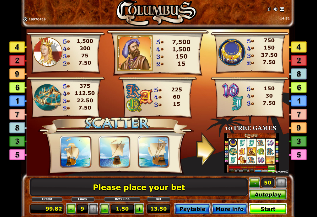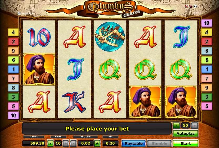 Most of the Gaminator slot games have the same menu bar setup at the bottom of the screen. Columbus is certainly no different. On this menu, there are buttons for choosing the number of paylines that you wish to play with, a pay-table button, a max bet button, start button and a button to place more than one coin per payline. In the upper right hand side of the screen, players have an auto play button, and a coin value button.