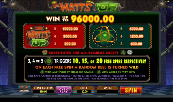 MicroGaming will say that up to 96,000 coins can be won in the Dr Watts Up slot. That is, with the bonus rounds. The standard non-progressive jackpot is fixed at 10,000 coins. In order to win that sum, players must line up 5 of the Dr Watts Up logos on any pay-line in the slot.