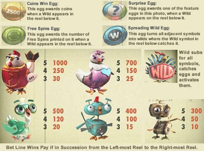 Golden eggs are Coin Win Eggs. If this appears above a wild, it will offer coin pay-outs of 50, 100, 200, 500, 1,000 or 2,500 coins. This is a kind of an instant win bonus.
