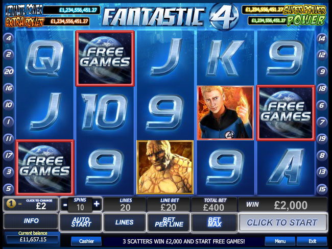 Fantastic Four is one of those slots that is available as a free play slot machine game. Of course, if you are seeking a big progressive jackpot win (as most gamers are when they play this slot), you are never going to land it playing for free. However, you can learn how frequently the bonuses are triggered, and how much a decent spell on the Fantastic Four slot machine would generally cost. You can play this slot completely free – it’s the exact same variation as can be played for real money by joining one of our featured PlayTech casino sites. Allow up to 1 minute for the game to load!