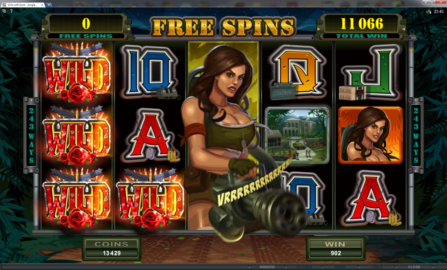 Of course, being a typical Microgaming slot – Girls with Guns features 243 paylines on its 5 reels. Because of the large number of paylines, you cannot wager on each individual line. As such, the minimum and maximum wagers are fixed at 0.30 per spin, and 150.00 per spin, respectively. Coin values go upwards from 0.01 to 0.25, and players can stake up to 20 coins per spin.