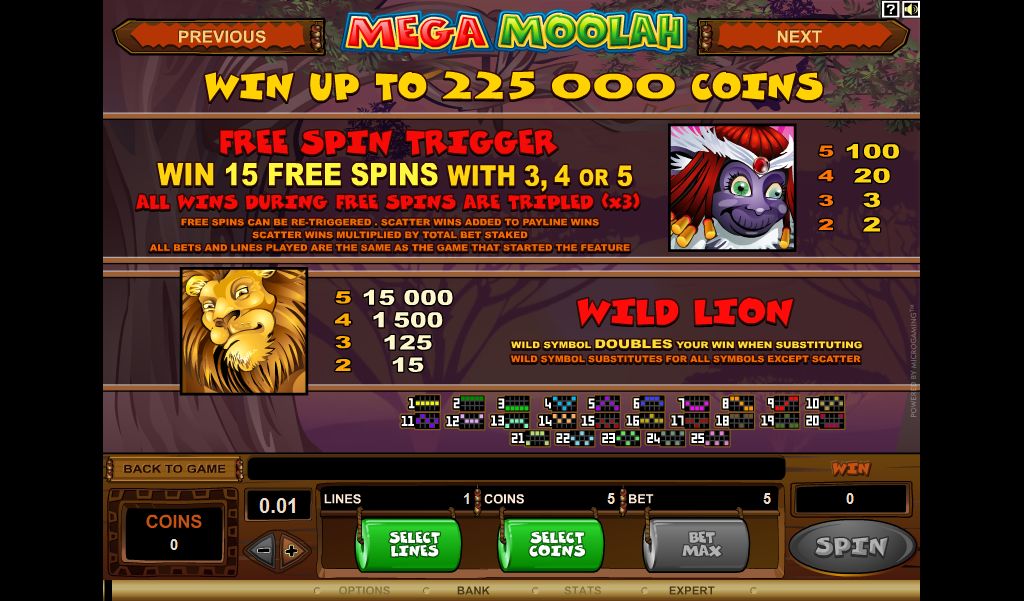 The menu bar for the Mega Moolah slot is very basic indeed. There are buttons which will enable you to view the pay-table, as well as adjust the value of your coins. From this menu, you can also choose how many lines you wish to play with, how many coins you wish to bet per line, and if you want to bet the maximum wager, you can.