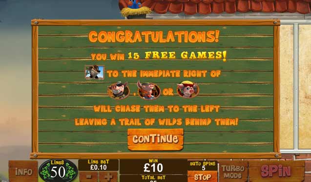 During the free spins game, the player will encounter the Pigs Running Wild feature. The bonus starts with 15 free spins. If the wolf appears to the right of any of the pig icons, it will chase the pig to the left until they both leave the reels. A trail of wolf wild icons will appear on every symbol that the wolf has touched in his pursuit of the pig. Players can win an additional 15 free spins with three more scatters, and free spins can continually be re-triggered indefinitely.