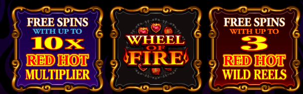 - Wheel of Fire Bonus. This is where you’ll be presented with a wheel and 10 firebombs to choose from. You can reveal an instant credit win or a multiplier that will be applied to ALL your current wins. There are 9 prizes and a jester in the bonus wheel. Feature ends when you reveal a jester under one of the firebombs.