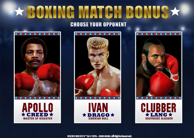 In the Knockout Bonus, players must choose their opponent, as they play as Rocky. A ten-round boxing match will then begin. You will pick up a cash prize for every round that Rocky manages to win. The final round, will be knock-out match. If Rocky knocks out his opponent before the final round, then the player is awarded a big cash prize, plus all the prizes that he or she would have won if they’d gone the distance! If Rocky himself is beaten, the bonus round ends and base game resumes.