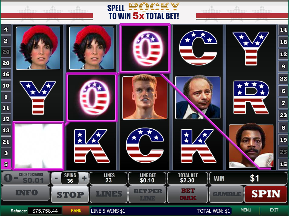 The scatter icon in the Rocky slot is the Italian Stallion icon. When this symbol appears 2, 3, 4 or 5 times on the reels, the player will bag 1, 5, 10 or 100 coin wins. They will also pick up 15, 20 or 25 free games when 3, 4 or 5 respective scatter icons are located anywhere on the reels.