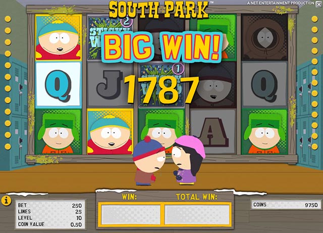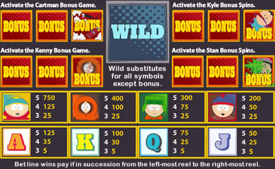 South Park is designed as a 5-reel, 25 payline video slot. You can choose coin values which range from 0.01 up to 1.00 per stake. Anything from 1 to 10 coins per line can be wagered in this slot. South Park can therefore be played from just 0.25 per spin, up to a maximum stake of 250.00 per spin.