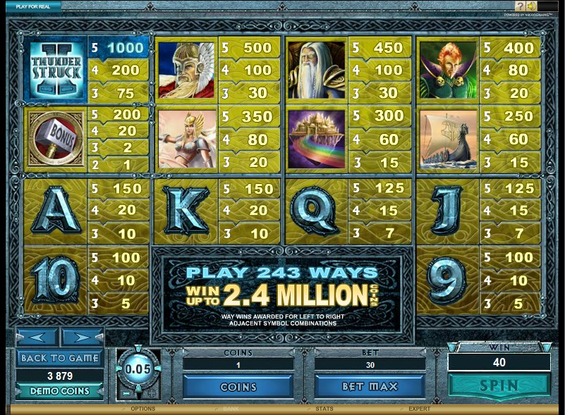 Thunderstruck II was one of the first 5-reel, 243 ways to win slots developed by Microgaming. Players can adjust their coin sizes to be worth 0.01 up to 0.05. They can also opt to stake anything up to 10 coins per spin. Notably, you cannot adjust the number of paylines that you wish to play with. Thunderstruck II can cost as little as 0.30 per spin to play, or as much as 15.00 to play. Either way, it is hardly going to bust your bank balance.