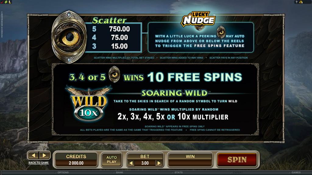 The Eagle Eye symbol is the game’s scatter. When this icon (which is circular) appears three or more times on the reels, the player will trigger a free spins bonus. The player will also pick up scattered wins for doing so. Sometimes, it may appear as though free spins are just out of reach. When this happens, the Lucky Nudge may come into play. This is a random event, which nudges the reel down or up slightly to make an almost unreachable scatter icon spin onto the screen, awarding you the free spins round that you almost missed out on!