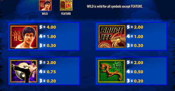 The Bruce Lee slots logo, a karate kicking Bruce and a dragon icon are also worth big pay-outs, roughly half the value of the jackpot if 5 are struck on any paylines. The more Asian and oriental cultural themed icons are worth less, whilst the weapons are worth the least of all the pay-outs in this video slot machine game.
