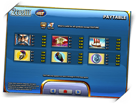 The wagering control bar is very simple in Zeus III. There are buttons to adjust the number of coins that you wish to stake, there is a spin button, an auto-play and a pay-table button. What could possibly be any simpler than that?
