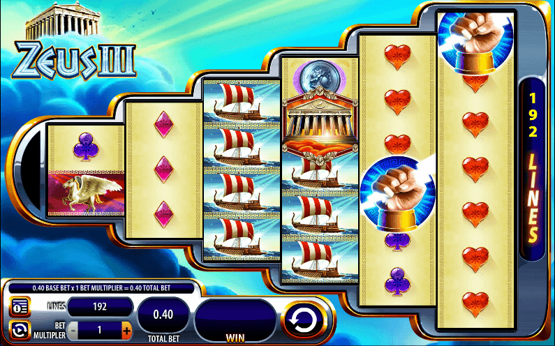 Zeus III contains six reels, each with a different number of symbols on them. WMS Gaming have chosen to give Zeus III, 192 paylines. Coin values in this slot are always fixed at 0.40, and players can stake anything from 1 to 300 coins per spin. Simple mathematics will tell you that Zeus III can be played for as little as 0.40 per spin, whilst the maximum stake costs you no more than 120.00 per spin to play.